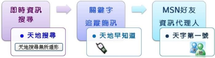 目前天地搜尋引擎已經可以化身為一位msn上的好友,隨時根據您的資訊需求來主動通知您了。想了解這一切,就要從 yahoo 開始說起了。 yahoo成立當時的internet, 網站數量還不多,所以yahoo就用人工的方式,整理成為一個分類索引,這就是最早的搜尋引擎了。 隨著網站成立越來越多,資料量也隨之暴增,此時 google 憑藉著優異的網頁評分技術,成為了搜尋引擎的龍頭,yahoo則轉型成為入口網站,提供各式的網路資訊服務。